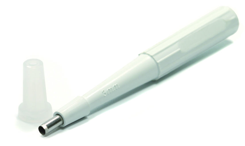 Lâmina circular de aço inox acoplada a uma haste plástica, semelhante ao modelo metálico existente em nosso meio, utilizado para biópsia de pele. Uso profissional.